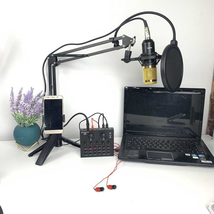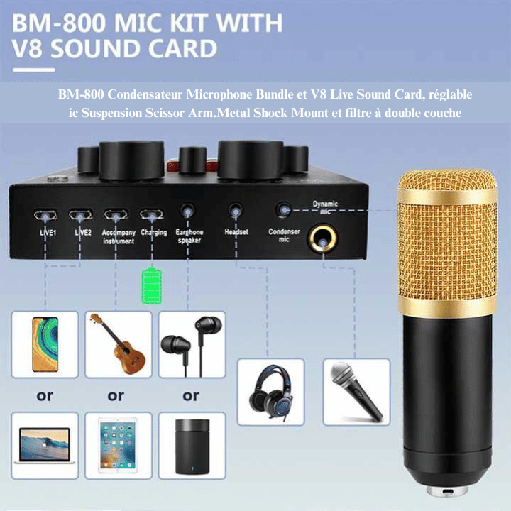 Passe au niveau pro avec le kit micro BM800 + carte son V8 et dis adieu aux grésillements, micros faiblards ou voix floutée.